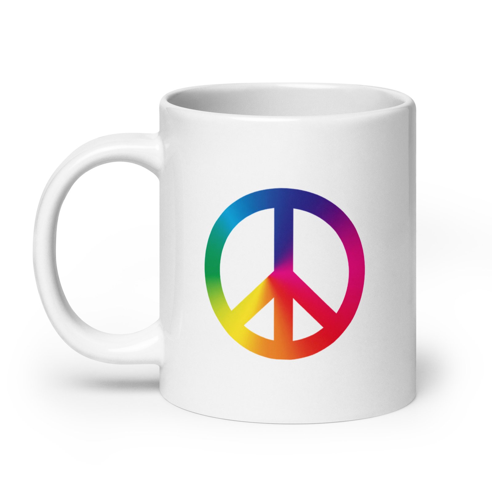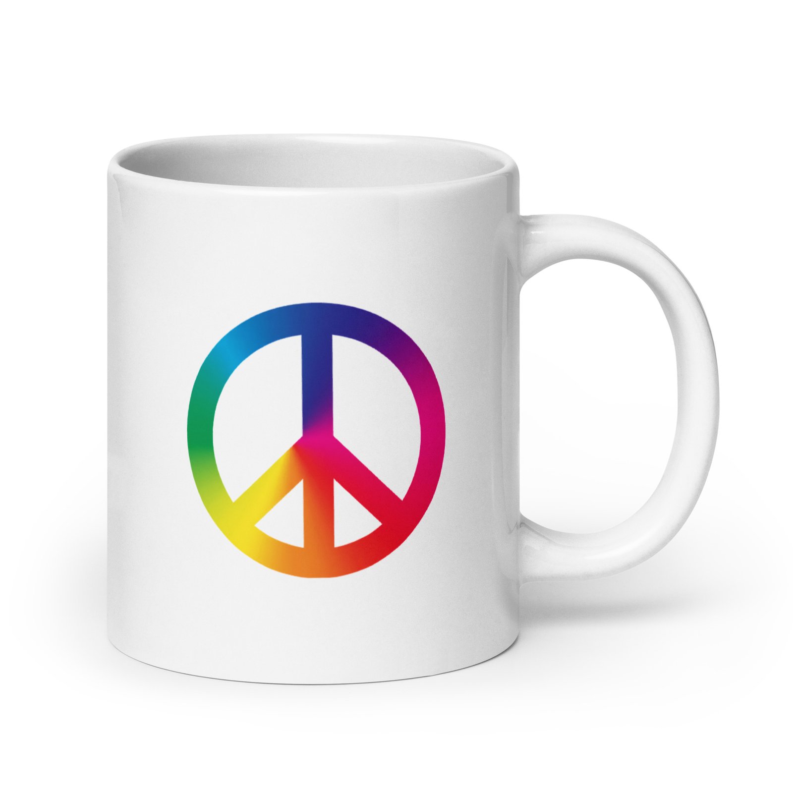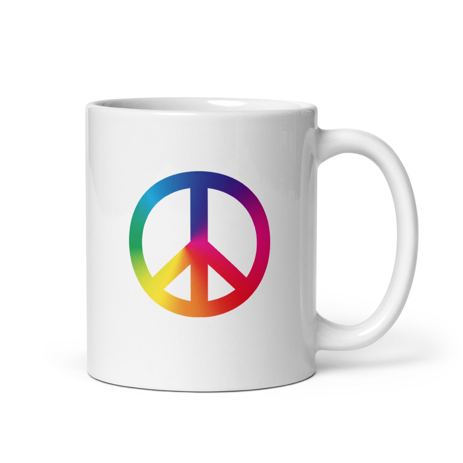 White glossy ceramic mug decorated with a colorful tie-dye peace sign graphic. Bright, high-contrast print and smooth glossy finish make it a cheerful everyday mug or gift for peace-and-vintage style lovers. Comfortable handle and sturdy build for daily coffee or tea use.