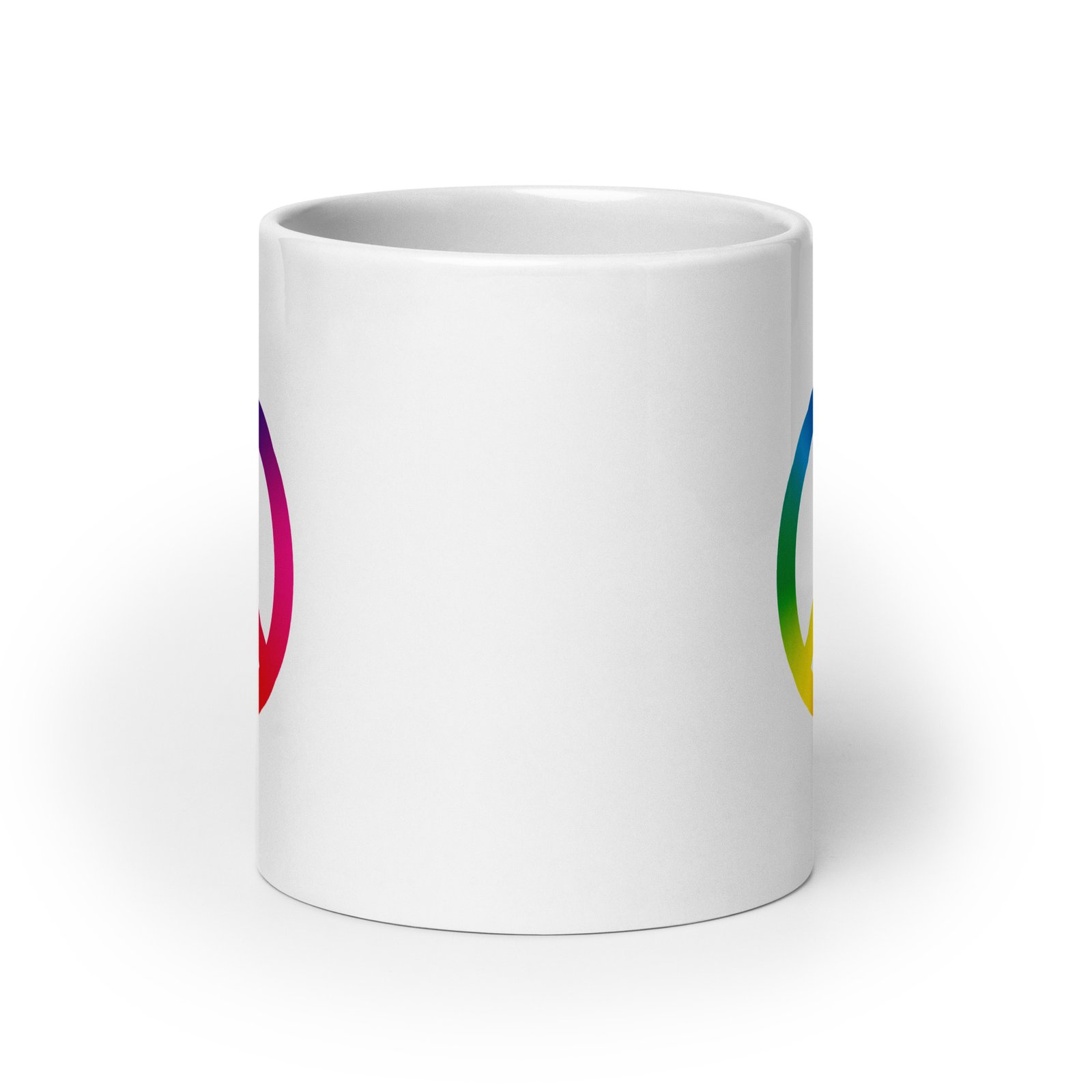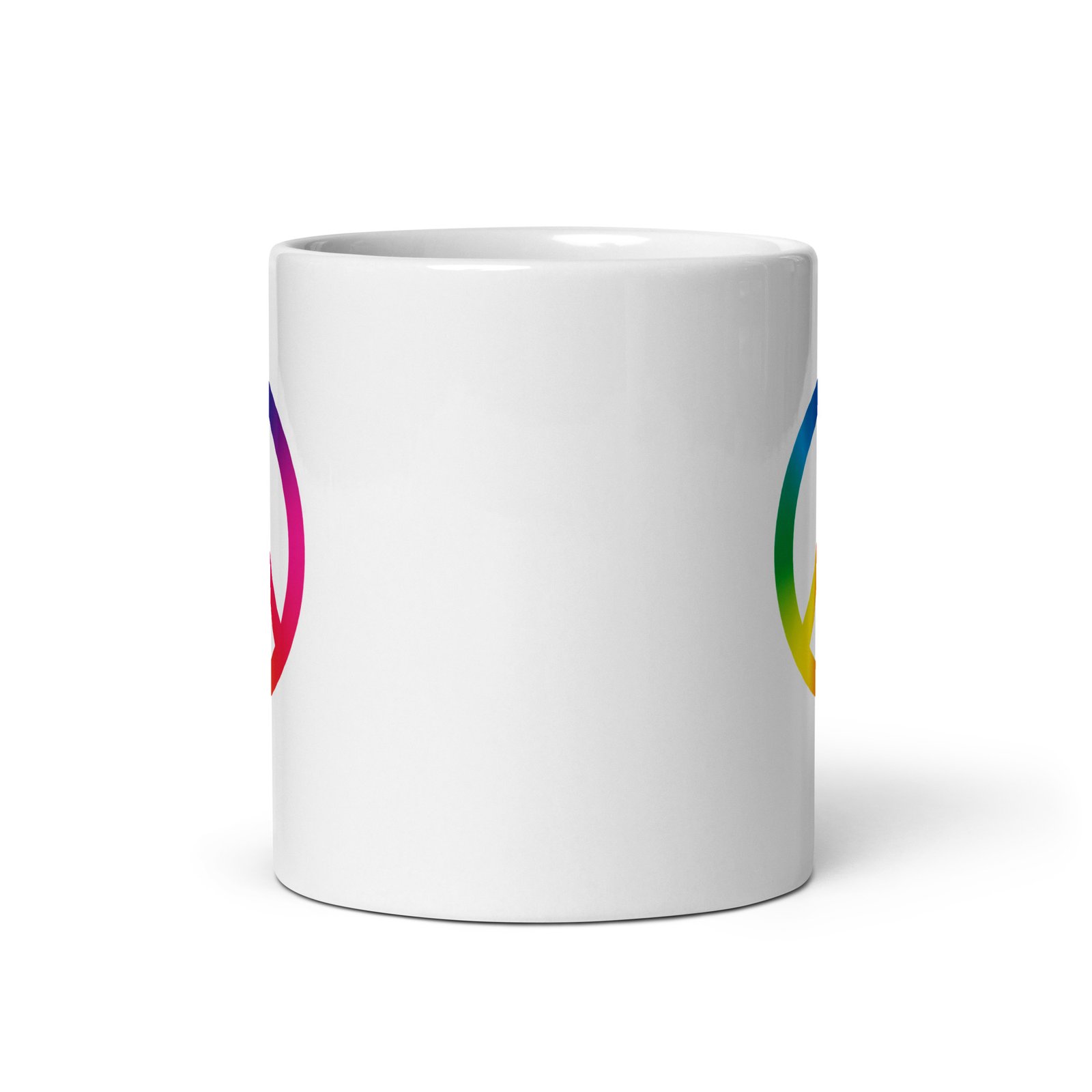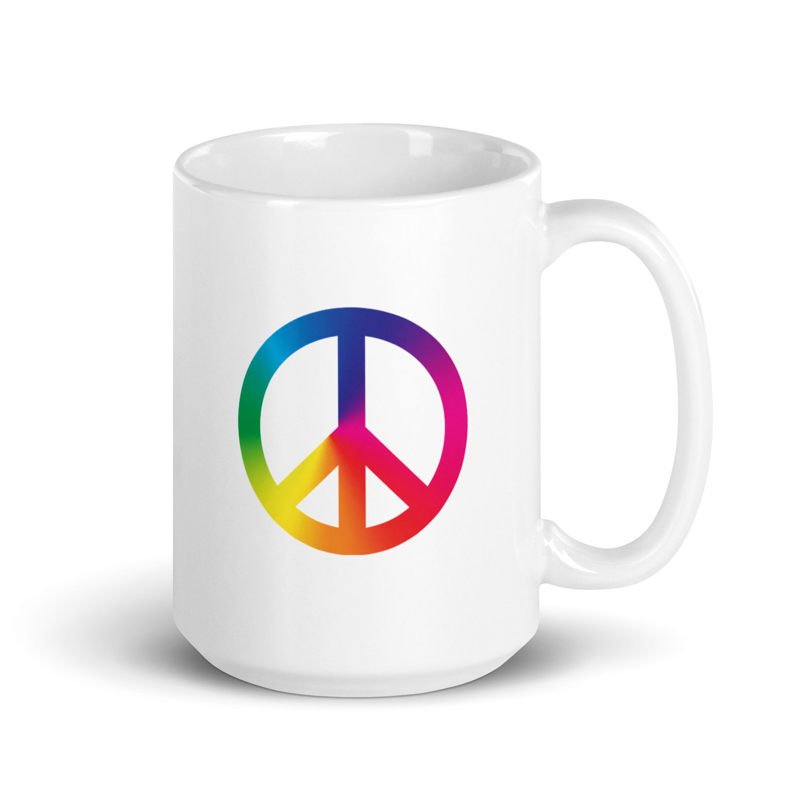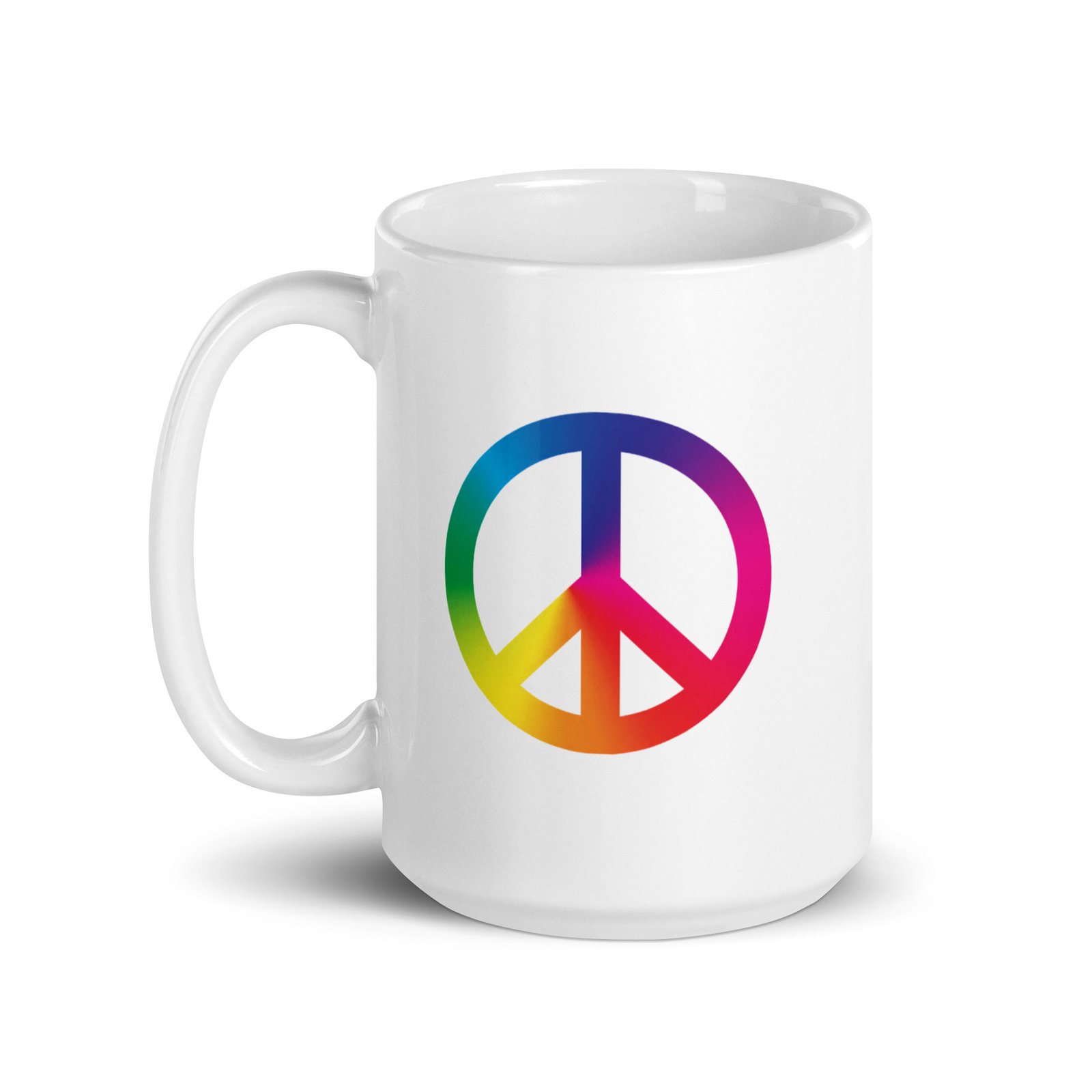 White glossy ceramic mug decorated with a colorful tie-dye peace sign graphic. Bright, high-contrast print and smooth glossy finish make it a cheerful everyday mug or gift for peace-and-vintage style lovers. Comfortable handle and sturdy build for daily coffee or tea use.