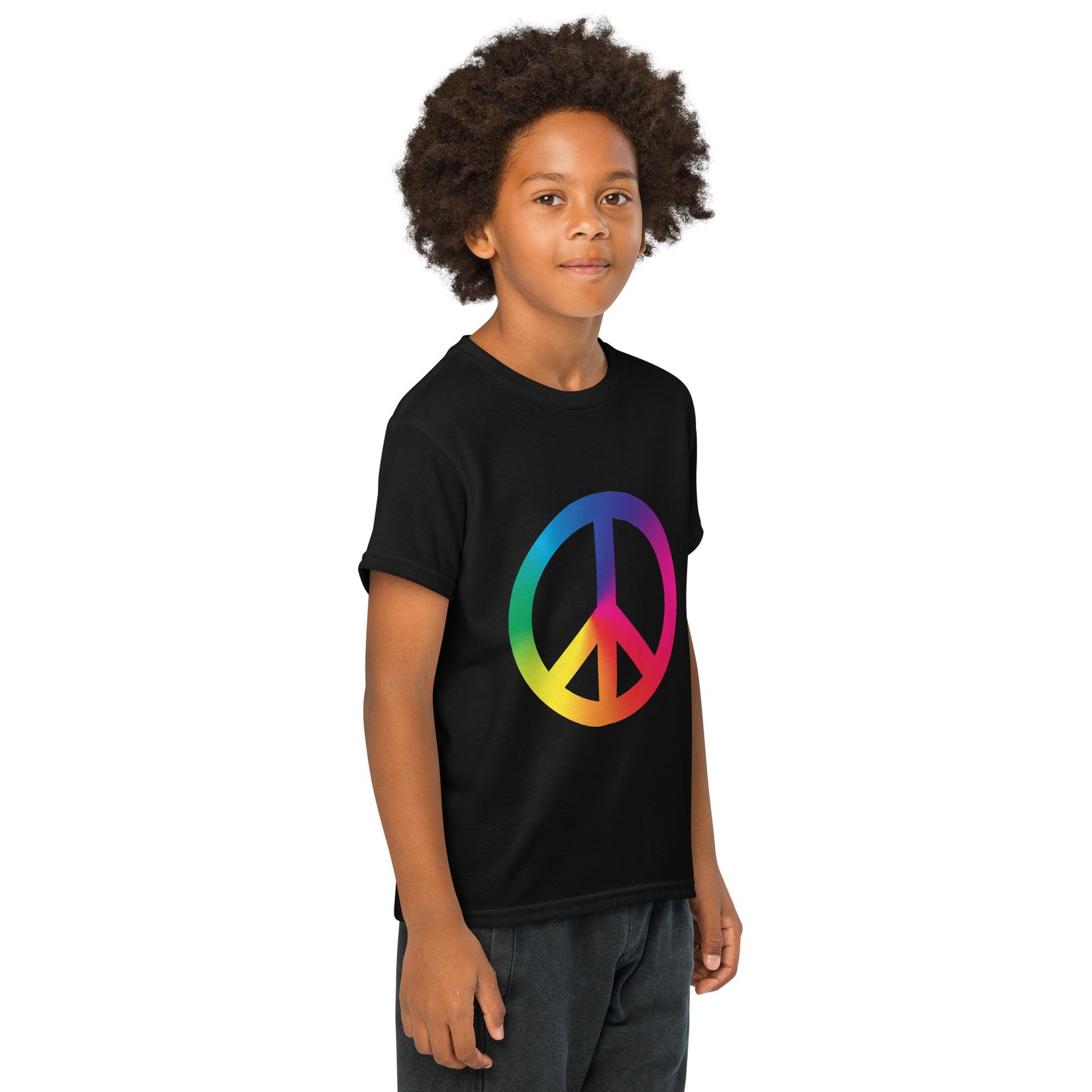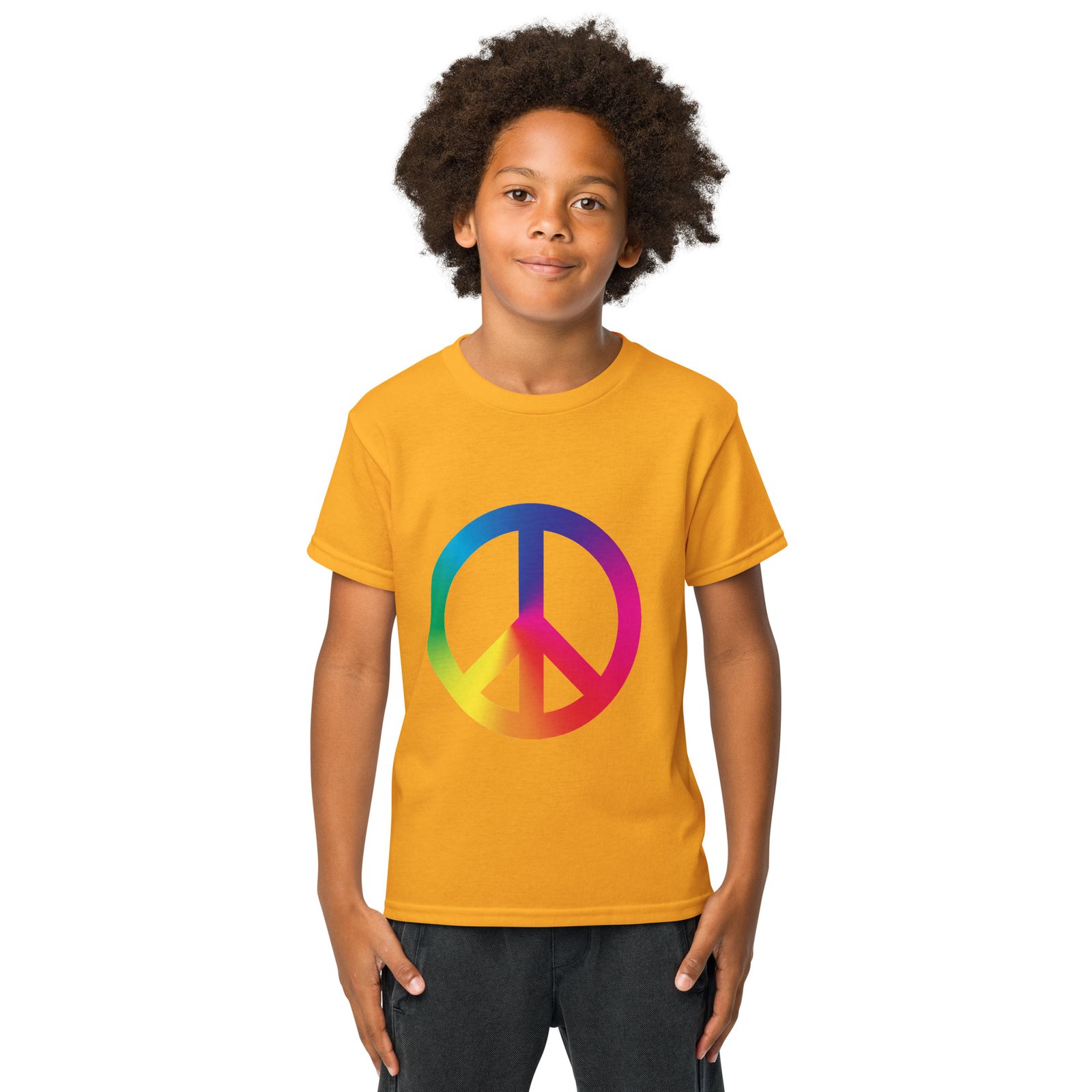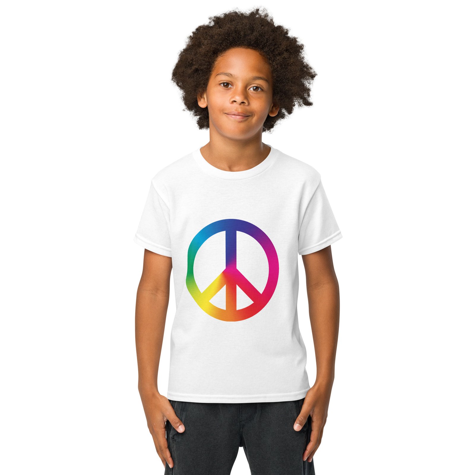 Youth tie-dye T‑shirt featuring a bold peace sign graphic — colorful, casual, and designed for everyday wear. Soft, comfortable fit in youth sizes suitable for unisex styling. Easy-care construction keeps colors bright and wearable for play or school.