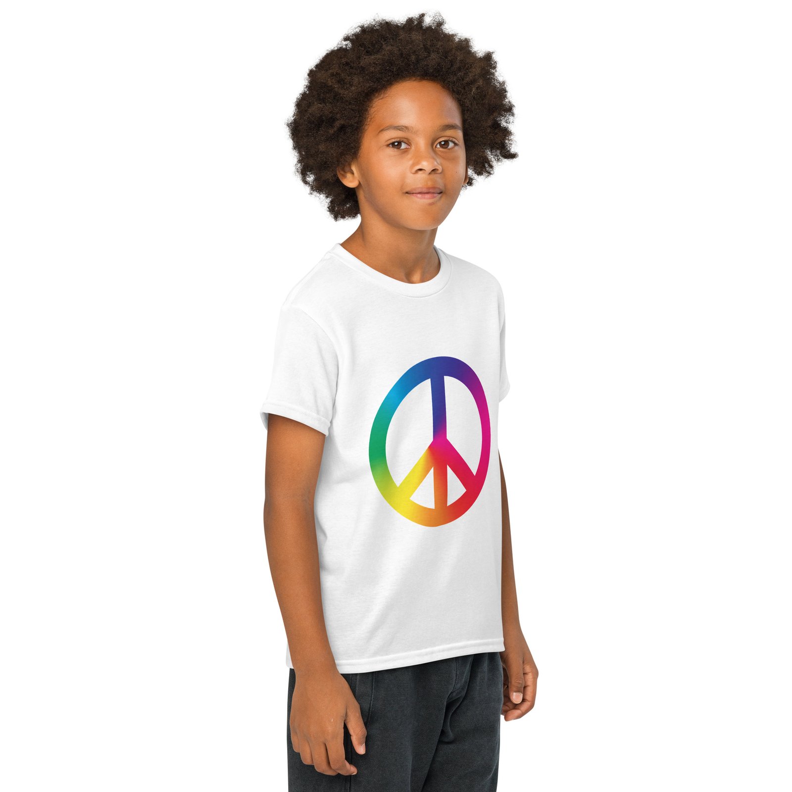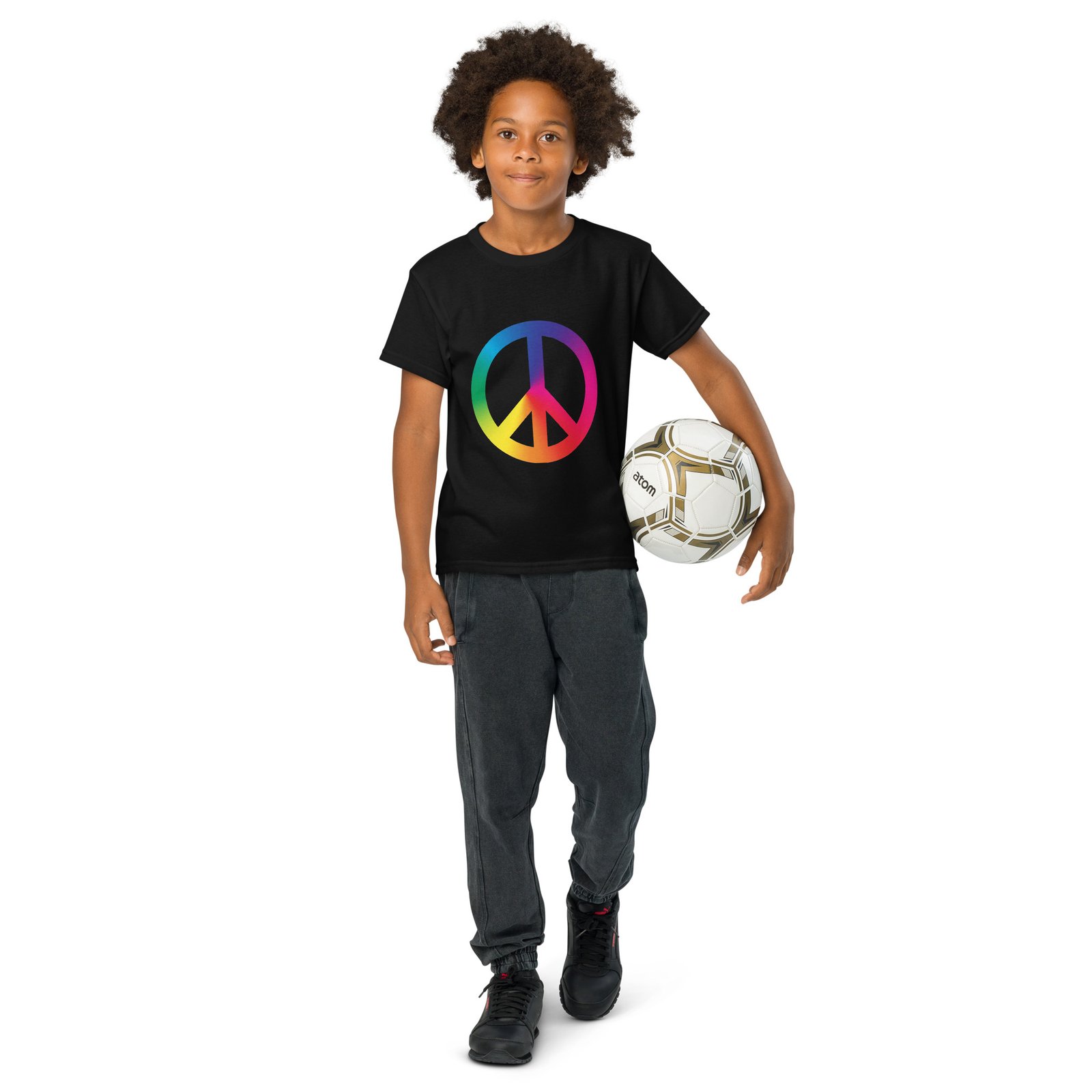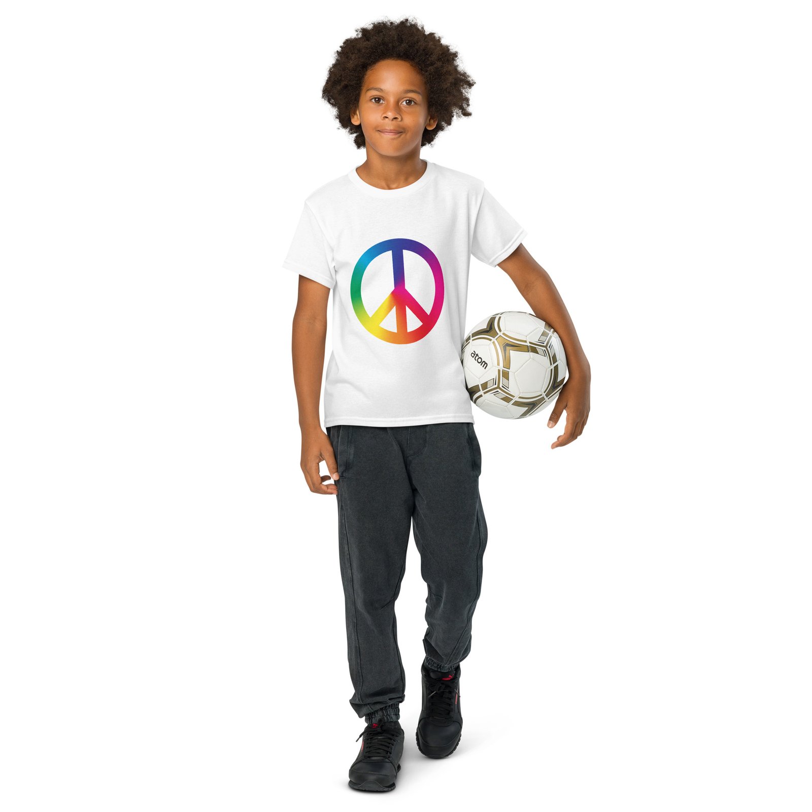 Youth tie-dye T‑shirt featuring a bold peace sign graphic — colorful, casual, and designed for everyday wear. Soft, comfortable fit in youth sizes suitable for unisex styling. Easy-care construction keeps colors bright and wearable for play or school.